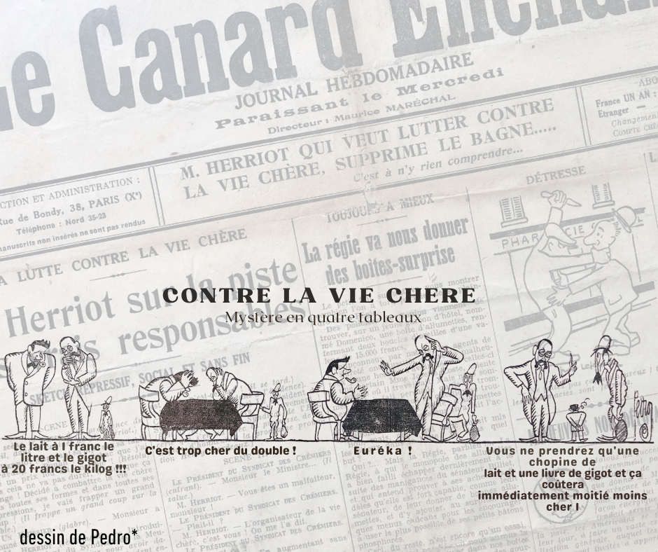 C’est dans ce contexte que Le Canard enchaîné du 17 septembre 1924 publie trois textes réunis par un fil conducteur : la lutte contre la vie chère. À sa manière, caustique et burlesque, le journal se fait le miroir d’un mécontentement populaire en tournant en dérision les promesses gouvernementales.