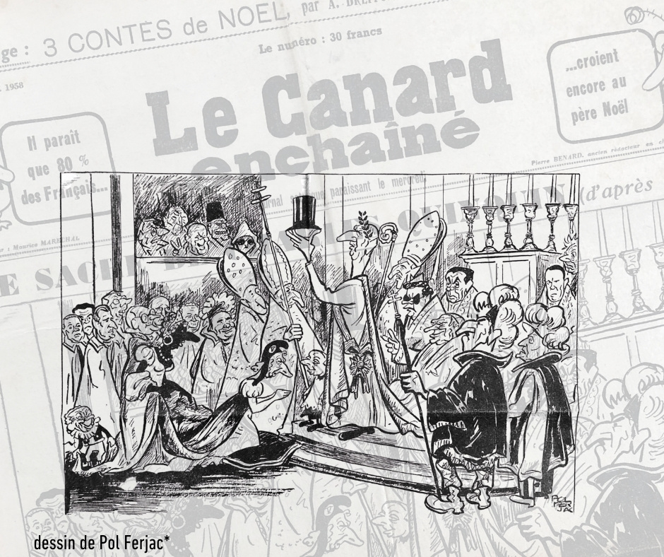 Ce 24 décembre 1958, pendant que les familles emballent les cadeaux, le journal emballe autre chose : un changement de régime en papier journal. Pol Ferjac dessine le sacre, Tréno écrit l’adieu, et entre les deux, on entend la même musique : la République a beau se dire “moderne”, elle adore encore les cérémonies. Le Canard, lui, garde la mauvaise habitude de regarder sous la mitre… et de compter les mains qui tiennent le gibus.