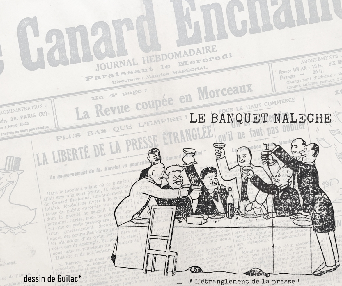 Au centre, le dessin de Guilac donne la clé de lecture en une seule image, intitulée comme une étiquette de cru cynique : « LE BANQUET NALECHE ». Les convives trinquent joyeusement « À l’étranglement de la presse ! ».