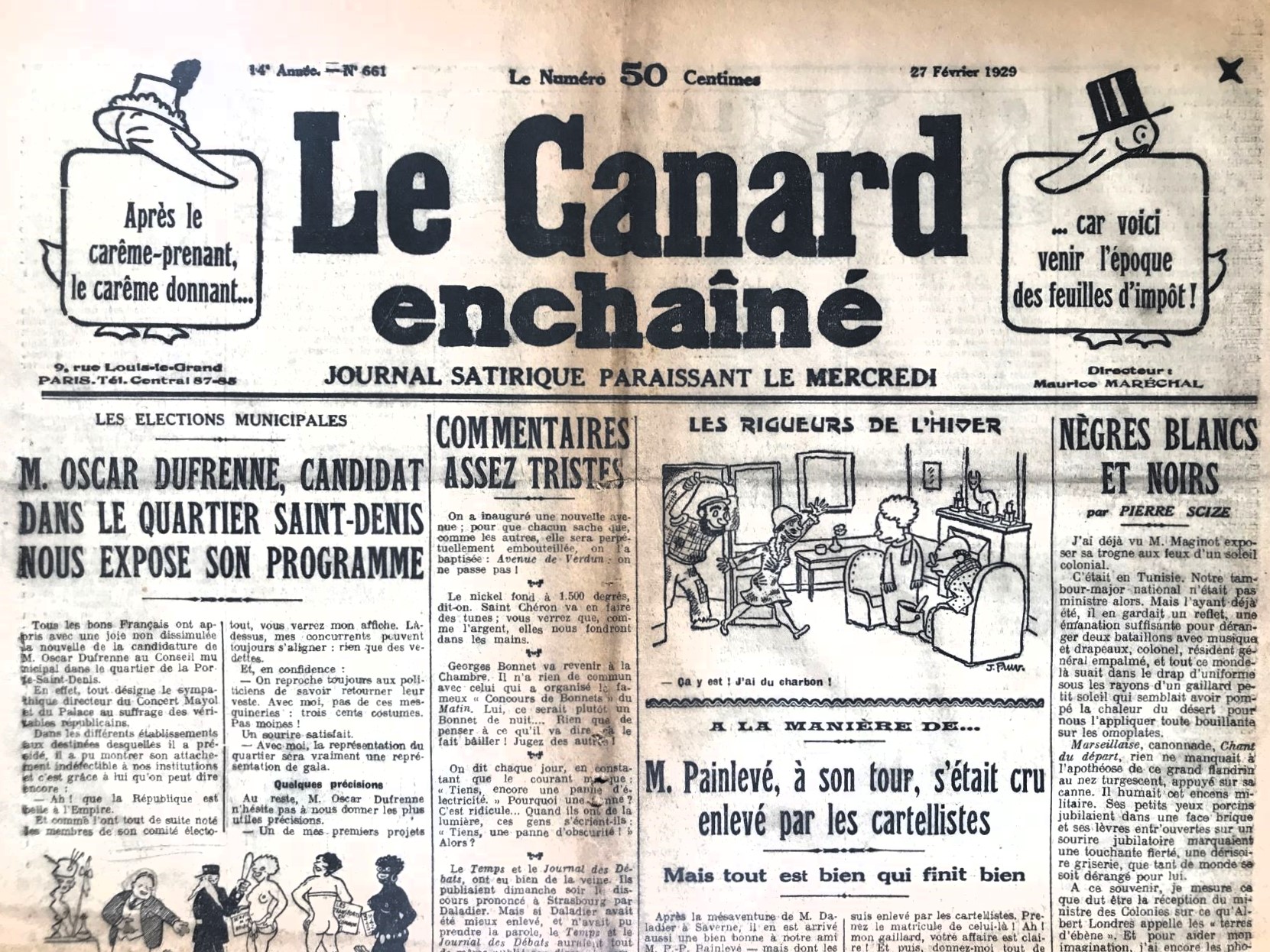 Le 27 février 1929, Le Canard enchaîné publie à sa une un long texte signé Pierre Scize, l’un des chroniqueurs les plus incisifs du journal. L’article, intitulé « Nègres blancs et noirs », s’ouvre sur la figure d’André Maginot, alors ministre de la Guerre, revenu d’un voyage triomphal en Afrique occidentale française. La presse coloniale et les actualités filmées ont largement relayé l’événement : Maginot, en uniforme blanc, visitant Dakar, salué par des foules d’indigènes en liesse.