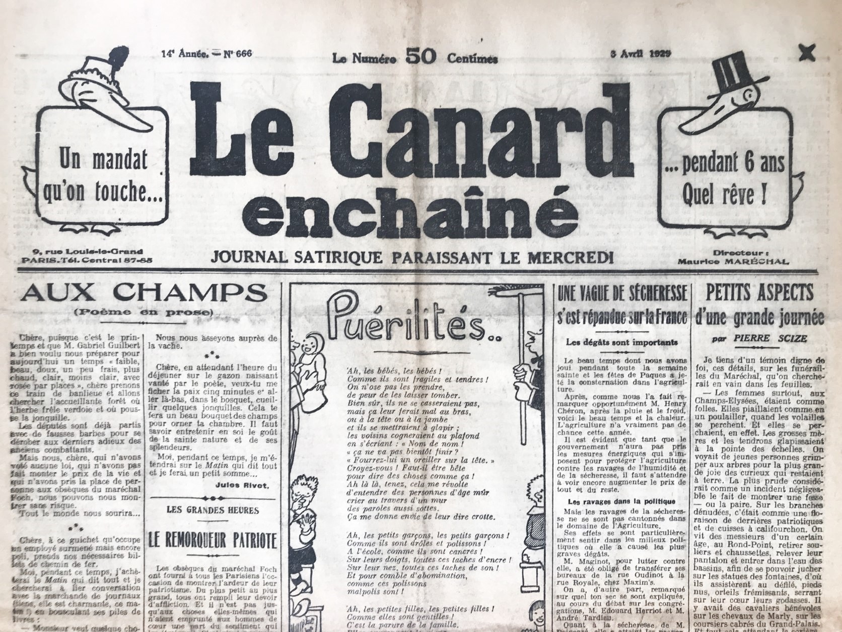 Le 3 avril 1929, Le Canard enchaîné juxtapose en pages 2 à 4 deux textes d’un humour très différent mais d’une ironie convergente. Le premier, signé Ernest Raynaud, s’intitule « Les enseignements du plébiscite italien ». Le second, Roger Salardenne, sous le titre « Encore un martyr de la science ! », se fait le défenseur goguenard d’un inventeur malchanceux. Ensemble, ils illustrent le double registre du Canard à la fin des années 1920 : la satire politique la plus acérée et la farce sociale la plus jubilatoire, réunies dans un même numéro.